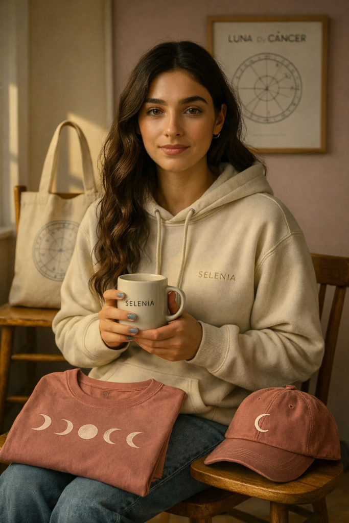 Ideas de producto: Remeras con signos zodiacales, posters con cartas natales, totebags con fases lunares, tazas con frases místicas.